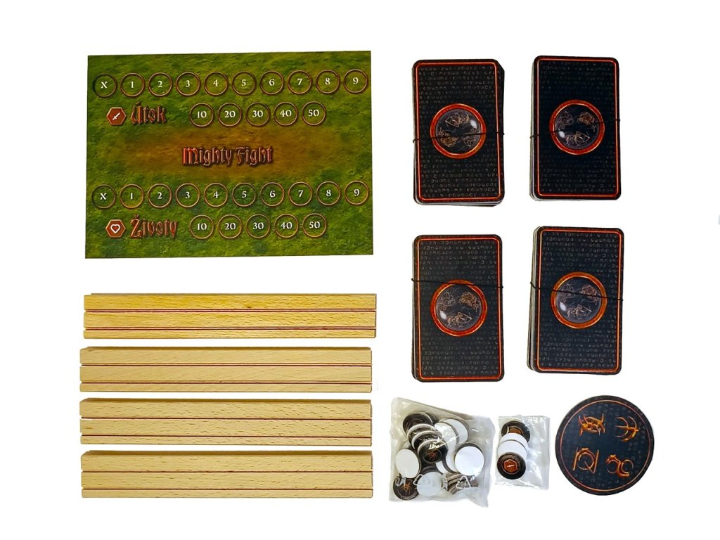 Mighty fight je karetní bojová hra, která se podobá slavným hrám jako jsou Magic the Gathering či Hearthstone. Hra je určena pro dva až čtyři hráče ve věku od 14 let a obzvláště potěší milovníky fantasy. Cílem hry je získání 10ti vítězných bodů, pomocí balíčku karet, který si hráč sám z dostupných karet sestaví. S těmito kartami se pak snaží ovládnout středové bitevní pole. Hra je protkána různými „komby“, kdy si své najdou jak úplní nováčci deskových her, tak zběhlí staří harcovníci. Mighty Fight si mohou užít buď 2 hráči v režimu duel nebo 3 či 4 hráči v režimu bitva. Poté co se hráči naučí, co která karta dělá, je hra dlouhá zhruba 5 až 30 minut. Mighty Fight vznikala pouze v ČR a výrobu tak zajišťují čistě čeští výrobci. Koupí hry tak nejenže podporujete české společnosti, ale navíc vytváříte i práci pro chráněnou dílnu, která zajišťuje výrobu dřevěných komponent. Přejeme příjemnou zábavu!